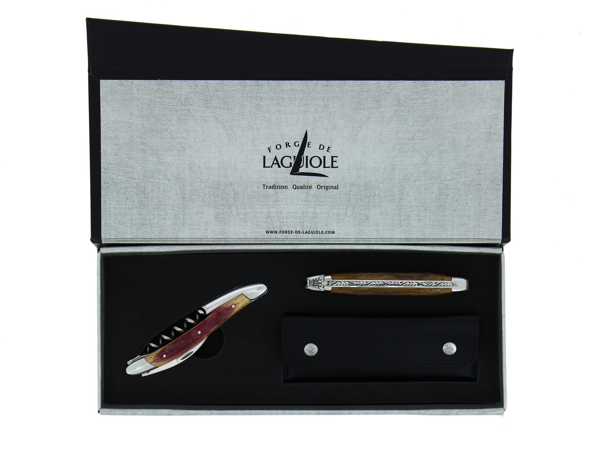 Dieses 12 cm lange Taschenmesser und das Sommeliermesser, mit Gravur des Hebels, der Serie Forge de Laguiole TRADITION begeistern mit Griffen aus Fasseiche. Beide Stücke verfügen über Edelstahlbacken und eine finish glanzend Oberfläche. Ergänzt wird das Set durch ein passendes schwarzem Lederetui. Dieses Sommeliermesser verfügt über eine Hebelsmit einem eleganten Motiv, das das Objekt noch verschönert. Beim Kauf dieses Sets profitieren Sie zudem von einem attraktiven Vorteilspreis.