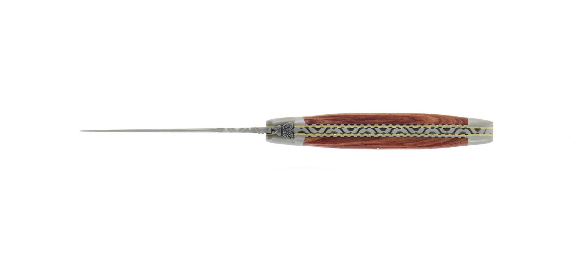 Entdecken Sie dieses Klappmesser ziseliert Biene, 12cm,Griff aus Rosenholz, Doppelplatinen inox/messing oben und unten guillochiert, satiniert