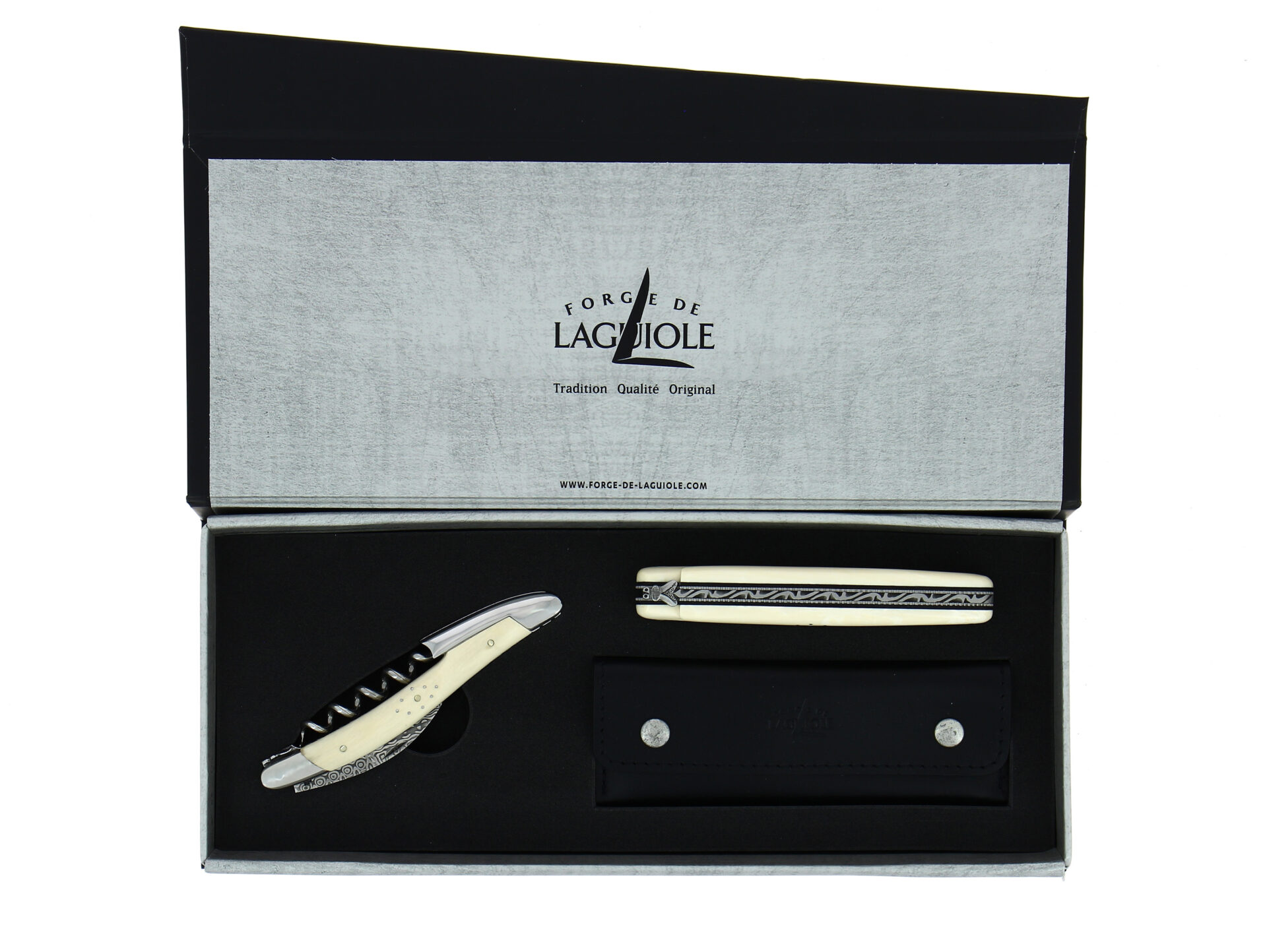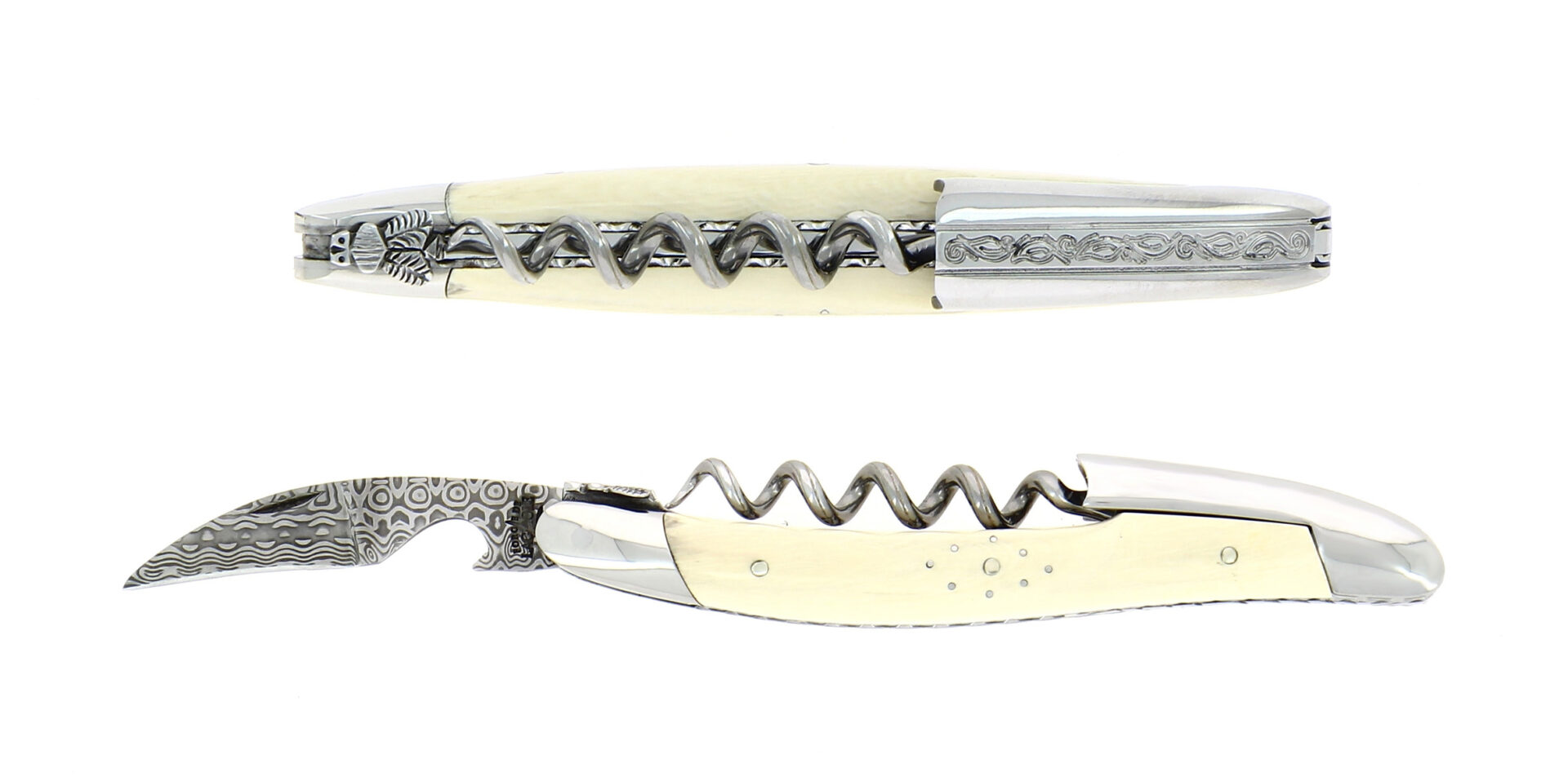 Ce couteau pliant 12cm et ce couteau de sommelier, Forge de Laguiole COLLECTION- édition 2025, ont un manche en cœur d'ivoire de mammouth finition brillante. Le couteau pliant est un plein manche en coeur d'ivoire de mammouth, avec une lame damas inox, des platines inox ciselées dessus et dessous, un placage noir en ébène, ainsi qu'une abeille et un ressort guillochés à la main. Le couteau de sommelier possède également une abeille, un ressort et des platines ciselés à la main, ainsi qu'une chape sculptée d'un motif élégant et une lame damas inox. Le coffret est complété avec un étui en cuir noir.