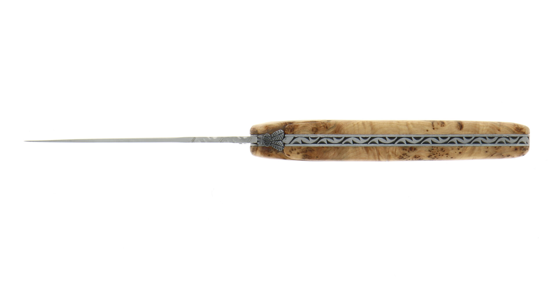 Le guillochage, travail d’orfèvrerie, est un ciselage composé de lignes, de traits ondés qui s’entrelacent sur le ressort. Dans notre collection, l’abeille et le ressort sont entièrement sculptés à la main par nos couteliers.