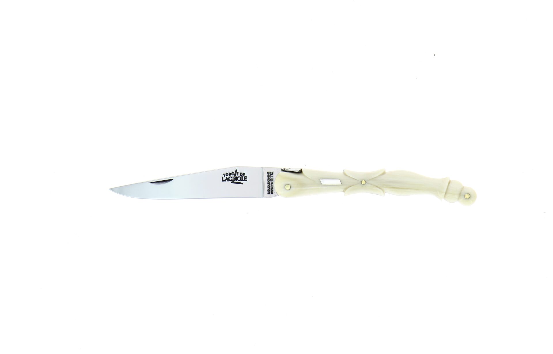 Ce couteau d'exception est un modèle 1 pièce, avec un manche en corne claire, sculptée en aile de pigeon. L'abeille, le ressort ainsi que les platines en laiton viennent sublimer ce couteau pliant.
